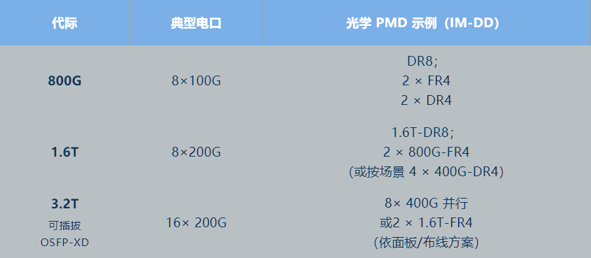 电口:200G/lane(IEEE 802.3dj, 224G PAM4),线性或重定时两种体系可选。PAM6或PAM8调制为电口速率提升到400G/lane带来了新的途径。
